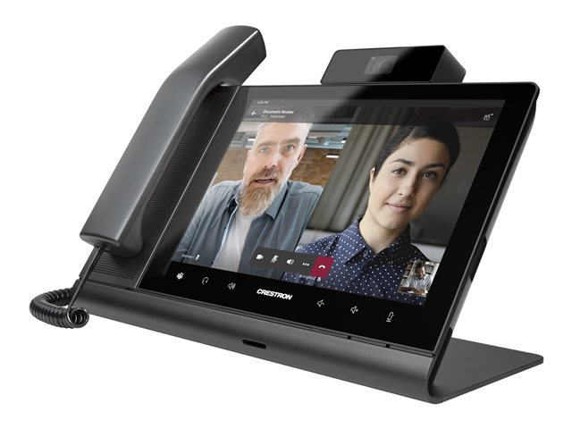 The Crestron Flex UC-P10-T-C-HS-I desk phone provides a premium video collaboration solution for use with the Microsoft Teams intelligent communications platform. It offers Full HD quality video and audio calling, capability to view and zoom the shared content, and full-duplex hands-free speakerphone capability in an elegant desktop design. It features a large 10 in. color touchscreen display, built-in Full HD camera with privacy shutter, hearing aid compatible handset, and wired or Bluetooth enabled headset support. The phone can be synced with a Microsoft Teams account, with contacts, schedules, voice mails, and other preference settings appearing on the phone's touchscreen.
