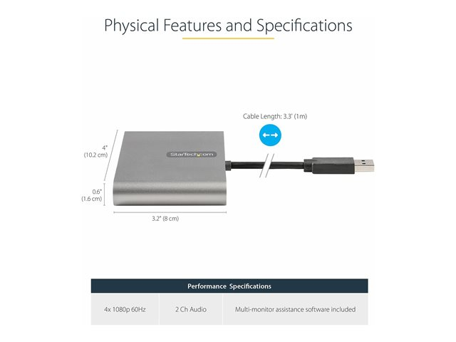 The USB Type-A to HDMI display adapter converter is equipped with a 3.3 ft. (1 m) attached USB-A cable that provides added distance between the adapter and your host device, ensuring a flexible setup. It also supports an automatic driver installation for ease of use.