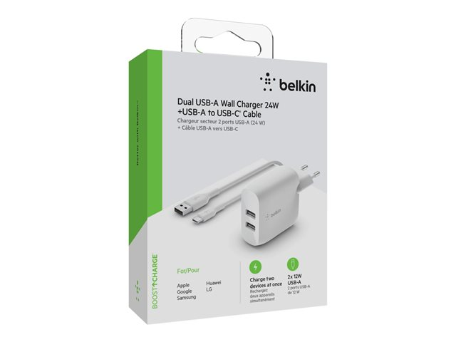 The BOOST?CHARGE Dual USB-A Wall Charger allows you to conveniently charge two phones, power banks, or tablets at the same time. It's perfect when multiple devices need a charge and space is limited.