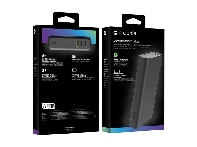 The mophie powerstation ultra offers a 25000 mAh capacity, ensuring power for your devices whether you're on the go or at home. This power bank accommodates your tablet, cellular phone, and laptop, providing a versatile charging solution. With three output connectors, it allows for simultaneous charging of up to three devices, making it a choice for those who need to stay connected without sacrificing time.