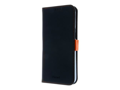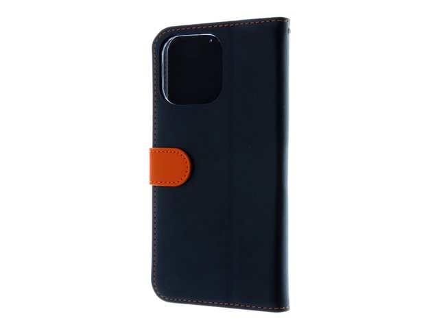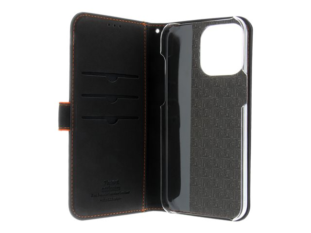 Insmat Exclusive - Lommebok for mobiltelefon - ekte skinn, polykarbonat, kartong+papir+aluminiumsfolie, bomullssting - svart / oransje - for Apple iPhone 15 Pro Max 650-3195