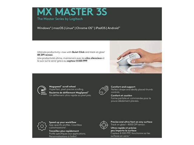Møt MX Master 3S - en ikonisk mus i ny drakt. Opplev hvert eneste øyeblikk av arbeidsflyten med enda mer presisjon, taktilitet og ytelse, takket være stillegående klikk og en 8 000 DPI track-on-glass-sensor.