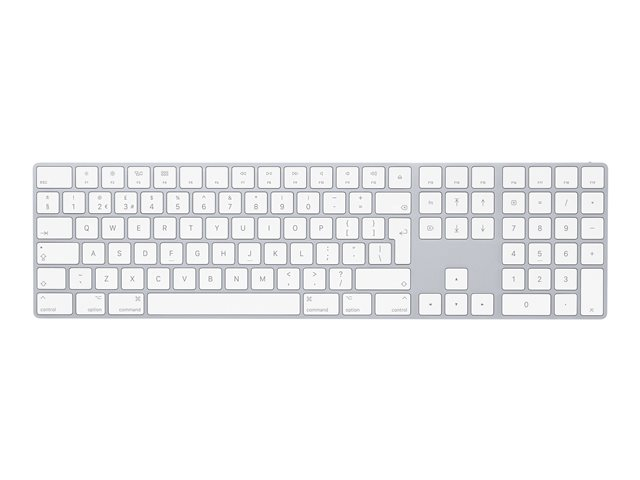 Magic Keyboard med numerisk tastatur har en utvidet layout med dokumentnavigasjonskontroller for rask rulling og piltaster i full størrelse for spilling. En saksemekanisme under hver tast gir økt stabilitet, mens optimalisert tastevandring og lav profil gir en komfortabel og presis skriveopplevelse. Det numeriske tastaturet egner seg også ypperlig til regneark og økonomiprogrammer. Og det innebygde, oppladbare batteriet har en utrolig lang levetid, slik at du kan bruke tastaturet i omtrent en måned eller mer mellom hver lading.
