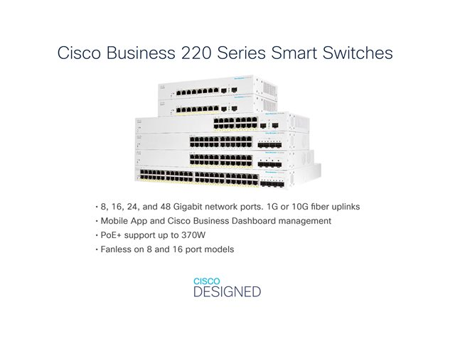 The Cisco Business CBS220-24FP-4G switch is simple and affordable smart switch for business-class network. CBS220 series bridge the gap between the affordability of an unmanaged device and the ease-of-use of smart switches. With their intuitive dashboard, mobile app support, and multiple Power over Ethernet (PoE) options, these switches deliver a solid business network.