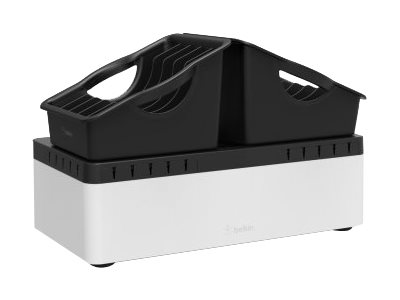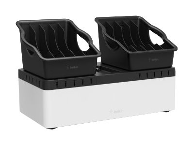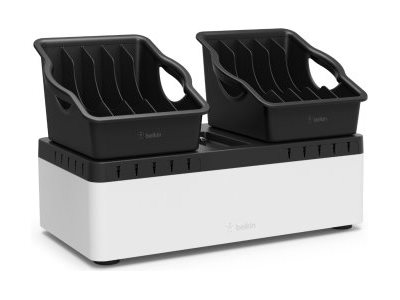 Store and Charge Go with portable trays is the ideal solution to store and charge multiple devices safely and conveniently. A base unit stores up to 10 devices and can be attached securely to a desktop or wall to save space. Removable five-compartment trays add portability for easy transportation. Two lightweight removable trays fit snugly within the base unit.