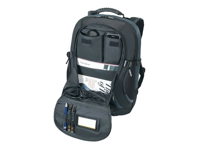Targus XL Laptop Backpack is perfect for the notebook user that has a lot going on and going along. It starts with a large separate, padded notebook compartment that fits most notebooks with 17" - 18" widescreens. This backpack includes a compartment for files and many other additional storage areas. Integrated in a front workstation are Smart Phone pocket and business card holder. Featuring an integrated water repelling protective rain coat that you can hide away in a secret pocket it ensures your notebook is protected even in the wet. Its molded handle, waist strap, extra back cushioning and sturdy nickel fittings will provide the maximum protection whilst carrying your large screen notebook ensuring you arrive at your destination in comfort.